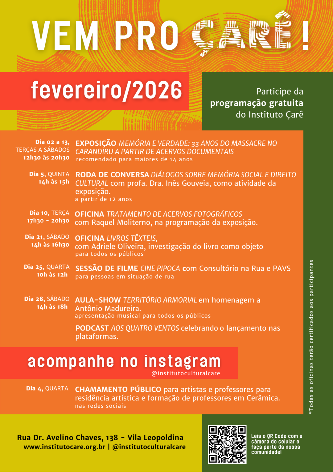 A programação do Instituto Çarê é gratuita e aberta ao público.